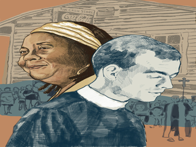 Each year, Episcopalians gather in Alabama to enact a liturgy remembering Jonathan Daniels and other civil rights martyrs. Activists Ruby Sales (left) and Jonathan Daniels (right). Daniels was killed in 1965 while helping register Black voters in Lowndes County, Alabama. (Illustration by Martha Park)