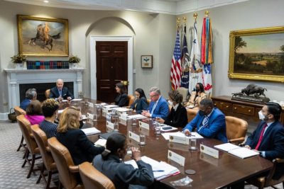 The New Democrat Coalition in the House of Representatives is calling for funding public education for students in every zip code. Members of the New Democrat Coalition meet with President Joe Biden at the White House, March 2022.