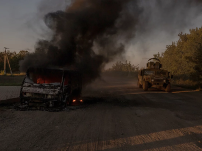 A Ukraine’s Humvee armored military vehicle drives past a burning car on a road near the border with Russia, in the Sumy region of Ukraine, on August 14. Roman Pilipey/AFP via Getty Images