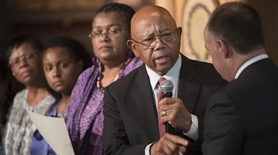 Joined by other descendants of enslaved people, Joseph Stewart (left) speaks to Georgetown University president John DeGioia (right) as the school announces actions it would take to atone for its history of enslavement in Washington on Sept. 1, 2016.
