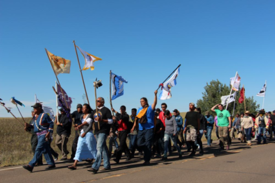 Several hundred people took part in a prayer walk on Sept. 14, 2016, from the Oceti Sakowin camp near Standing Rock Reservation in North Dakota to the site up the road where Dakota Access began digging over Labor Day weekend for construction on a nearly 1,200-mile pipeline project. (RNS/Emily McFarlan Miller)