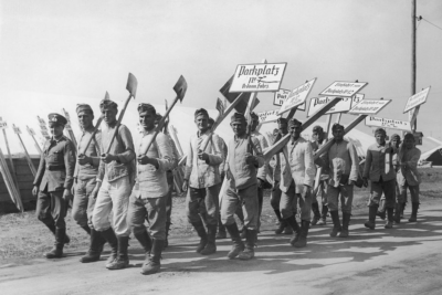 The American South, apartheid South Africa and Germany in the 1930s: One demographic caused destruction and chaos. A detachment of German soldiers on their way to install parking signs in preparation for the 8th Congress of the Nazi Party at Nuremberg, 3rd September 1936.