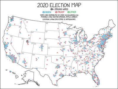 The goal of the map, Munroe says, is to show where voters are. “My map isn’t great for telling at a glance who won a given state,” he explained on Twitter, but it will help answer a “basic question like ‘Where do most Trump voters in Illinois live?’”First of all, it illustrates the basic truth that few people live in the interior of the country, something even the most detailed red/blue maps tend to obscure. Second of all, Munroe’s illustration of the results shows how talk of secession — of “red states” and “blue states” going their separate ways — is deeply misguided. Every state, every city, every county, every community has Trump voters and Biden voters. Read more