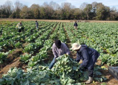 Workers harvest collard greens on John Brown’s farm in Dallas County, Alabama. Brown, who raises vegetables on the same land his father purchased about 80 years ago, is one of seven farmers in the Black Farmers Initiative, formed by the Edmundite Missions in partnership with the Deep South Food Alliance. (Courtesy of John Brown)