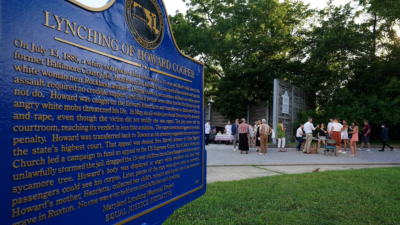 A remembrance for Howard Cooper in Towson, Md., in 2022. The Black teenager was lynched by a White mob in 1885 outside what was then the Baltimore County Jail. Historians estimate there were 4,084 racial terror lynchings in 12 Southern states between 1877 and 1950. (Bonnie Jo Mount/The Washington Post)