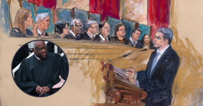 Background: This artist sketch depicts the scene in the Supreme Court as the justices — Justice Clarence Thomas fourth from left — hear arguments about the Colorado Supreme Court’s ruling that former President Donald Trump should be removed from the primary ballot on Feb. 8, 2024 (Dana Verkouteren via AP)