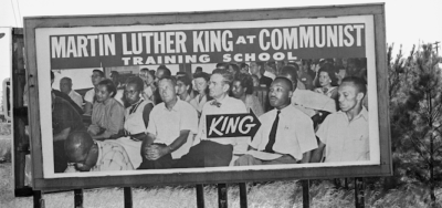In recent books, Adolph L. Reed Jr. and Imani Perry offer divergent explanations of Southern inequality. A photograph taken by civil rights marchers on the way from Selma to Montgomery, Alabama, of a billboard depicting Martin Luther King Jr. at the Highlander Folk School (Getty Images)