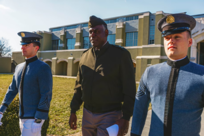 Retired Maj. Gen. Cedric T. Wins, center, Virginia Military Institute’s first Black superintendent, walks with cadets Ethan Miles, left, and Reece Demory after speaking to potential students and families during an open house event. (Justin Ide)