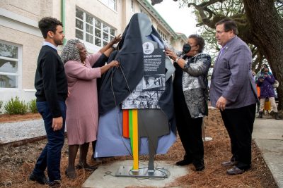 Lt. Gov. Billy Nungesser, right, watches as Leona Tate, left, helps unveil a new Louisiana Civil Rights Trail marker on Feb. 1 in New Orleans.