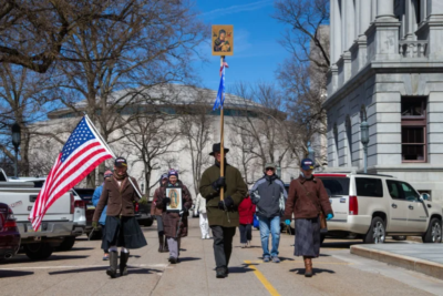 Pro-Trump Christian nationalist Jericho Marchers march around the Pennsylvania State Capitol in Harrisburg, Pa. after meeting with several Republican state legislators on March 15, 2021