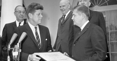 Sixty years ago, as Southern governors criticized civil rights protests and fought integration, one broke ranks and gave a remarkable inauguration address: He called for equal opportunities for all his state’s residents. North Carolina’s Terry Sanford, then 43 years old, was one of the first major Southern politicians to endorse John F. Kennedy for president. The two Democrats — energetic World War II veterans born three months apart — campaigned together across North Carolina in the fall of 1960. Sanford won the governor’s race and helped Kennedy carry the state in that nail-biting election. Shown is North Carolina Gov. Terry Sanford who presents a scroll to President John F. Kennedy at the White House on April 27, 1961.   Read more