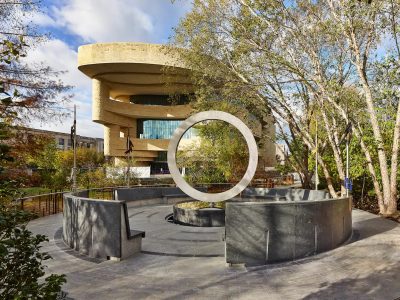 The memorial itself is simple, and mostly abstract. A large steel circle is set perpendicular to a black masonry drum, which is animated by a gently flowing pool of water. On ceremonial occasions, including Veterans Day and Memorial Day, a flame at the base of the circle will be lit. Visitors approach the memorial, dubbed the “Warriors Circle of Honor,” via a short, elevated walkway framed by oxidized metal railings and passing by the seals of the five main branches of the U.S. military. Read more