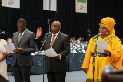President Cyril Ramaphosa of South Africa, shown being sworn in as a parliamentarian last month, announced a broad new coalition cabinet on Sunday.