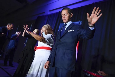 Ralph Reed prays on stage during a Donald Trump campaign event courting devout conservatives by combining praise, prayer and patriotism, Thursday, July 23, 2020, in Alpharetta, Ga.