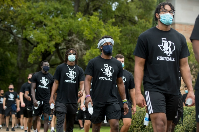 Students say they’re treated more like machines than humans. Rice University football players march across the Houston campus in a show of unity by the team to protest systemic racism in September 2020. (Photo by Brett Coomer/Houston Chronicle via Getty Images)