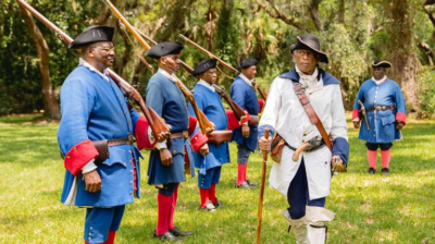 Soldiers reenact a battle at Fort Mose. Located just outside of St. Augustine, Fort Mose was the first free, Black settlement in what would become the United States of America. Florida Park Service