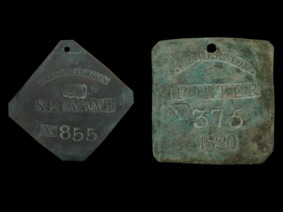 Starting in the late 17th century, enslavers in Charleston, South Carolina, began hiring out their enslaved laborers to earn some extra money. From 1783 onward, they were required to register these workers with the city and pay a fee. In return, they received badges listing various occupations, such as servant, carpenter, porter or mechanic. Enslaved individuals sewed the badges onto their clothing and were required to wear them at all times. Read more
