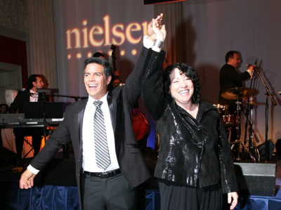 Supreme Court Justice Sonia Sotomayor waves to the crowd after dancing salsa with actor Esai Morales at The National Hispanic Foundation for the Arts (NHFA) annual gala in 2009.