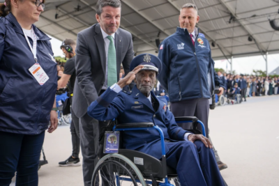 The administration is trying to rewrite history by deleting references to the Tuskegee Airmen, women and others with milestone achievements in the military. U.S. World War II veteran and Tuskegee Airman Enoch “Woody” Woodhouse salutes as he arrives for a ceremony to mark the 80th anniversary of D-Day at Omaha Beach in Saint-Laurent-sur-Mer, Normandy, France, June 6, 2024