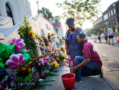 In this June 20, 2015, file photo, Allen Sanders, right, kneels next to his wife, Georgette, both of McClellanville, South Carolina, as they pray at a sidewalk memorial in memory of the shooting victims in front of Mother Emanuel AME Church in Charleston, South Carolina. (AP Photo/David Goldman, File)