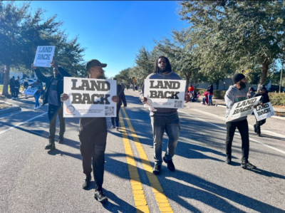 Orange County Public Schools plans to sell the remaining 100 acres of a historic Florida school site to private developers by March 31. The Land Back 1887 organization works during the 2023 MLK Parade in Eatonville, Florida, to inform the community about the planned sale of the remaining Robert Hungerford Preparatory High School site to developers. (Julian Johnson)