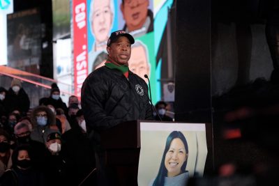 New York Mayor Eric Adams speaks at a Jan. 18 vigil for Michelle Go, who was killed in a Times Square subway station the weekend before. | Spencer Platt/Getty Images