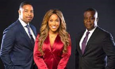 The Black News Channel hosts Mike Hill, left, and Sharon Reed with CEO Princell Hair. Photograph: AP