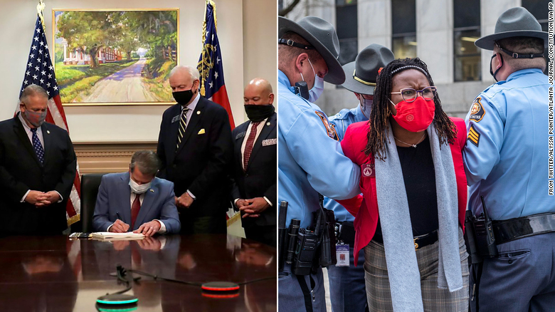 If you’re trying to figure out the impact of the new Georgia law restricting voting rights, two photographs will tell you everything you need to know. The first photo shows Georgia Gov. Brian Kemp signing the sweeping law, which many argue will make voting harder for people of color. He is sitting at a table in a stately room, flanked by six men in suits and before a portrait of what seems to be a painting of an antebellum, plantation-styled home. The second photo shows two beefy White police officers arresting a distressed-looking Black woman — Georgia state Rep. Park Cannon — after she knocked on Kemp’s office door repeatedly while he announced the signing of the bill into law. The symbolic contrast between the two images, both taken within minutes of each other Thursday evening at the Georgia Capitol, is hard to miss. Read more