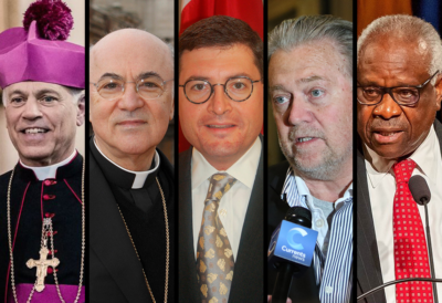 From left: San Francisco Archbishop Salvatore Cordileone; Archbishop Carlo Maria Viganò; Leonard Leo; Steve Bannon; and U.S. Supreme Court Justice Clarence Thomas (CNS/Courtesy of Franciscan University of Steubenville/Ryan Nolan; Paul Haring; Courtesy of the Federalist Society; Gregory A. Shemitz; Courtesy of University of Notre Dame/Peter Ringenberg)