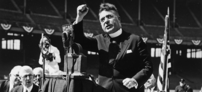 Rachel Maddow’s podcast tells the story of American Nazis in the 1940s. But the era’s real and lasting authoritarian danger came from the spectacular growth of a national security state. Shown is Father Charles Coughlin delivers a radio speech (Fotosearch/Getty Images).