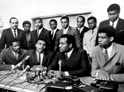 Jim Brown, seated third from left, invited Bill Russell, Muhammad Ali, Kareem Abdul-Jabbar (then known as Lew Alcindor) and other leading Black athletes to support Ali in 1967.Credit…Tony Tomsic/Associated Press