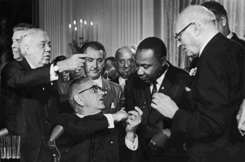The government under President Donald Trump is bending the arc of US history in a new direction, away from the civil rights focus of the past 60 plus years. Addressing or even acknowledging racial injustice toward people of color is out. President Lyndon B. Johnson shakes the hand of Dr. Martin Luther King Jr. at the signing of the Civil Rights Act.