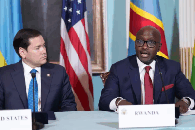 Rwanda’s Foreign Minister Olivier Nduhungirehe speaks during a Declaration of Principles signing ceremony with Secretary of State Marco Rubio, left, and Congo’s Foreign Minister Therese Kayikwamba Wagner on April 25 at the State Department in Washington.