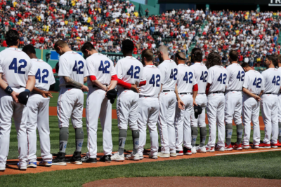 The Boston Red Sox and other teams honored Jackie Robinson on April 15, 2022. (Michael Dwyer/AP)