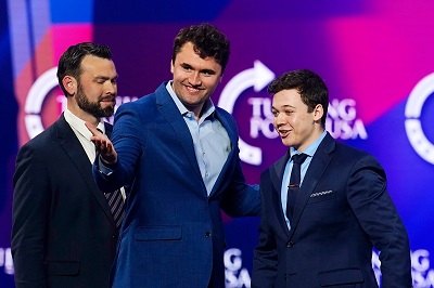 Kyle Rittenhouse, right, is introduced to a cheering crowd by Charlie Kirk, middle, founder of Turning Point USA, at a panel discussion at the Turning Point USA America Fest 2021 event, Monday, Dec. 20, 2021, in Phoenix. The panel discussion, called “Kenosha On Camera,” comes a month after Rittenhouse’s acquittal on charges in the deadly Kenosha shootings in 2020. (AP Photo/Ross D. Franklin)