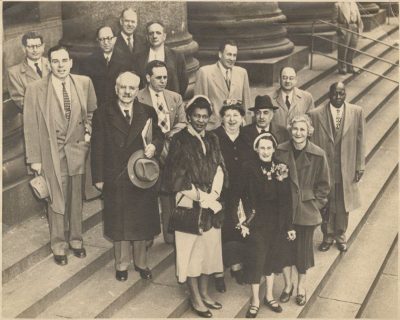 American anticommunism has always been an anti-democratic movement that seeks to silence radical voices. At its core, anti-communism has been deployed to quell radical left-wing dissent, prevent social justice goals, and construct progressivism as a threat to individual freedom. The FBI under J. Edgar Hoover’s leadership took it upon itself to police progressive activists and in so doing undermined the liberty of those with radical beliefs. But this policing did not stop with communists; their families, friends, and children were also put under surveillance and sometimes harassed in the process. Shown is Claudia Jones (2nd row, 1st from left) with fellow Smith Act defendents before U.S. Federal Court building, 1953 Read more