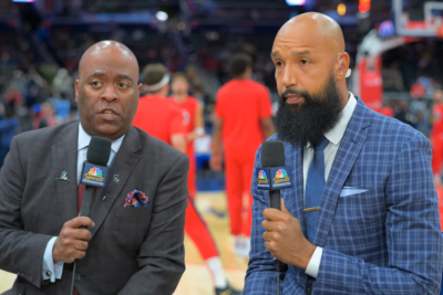 Wizard TV announcers Chris Miller and Drew Gooden are two of the three members of the NBA’s only all-Black broadcast crew. Sideline reporter Meghan McPeak is the third member. (John McDonnell/The Washington Post)