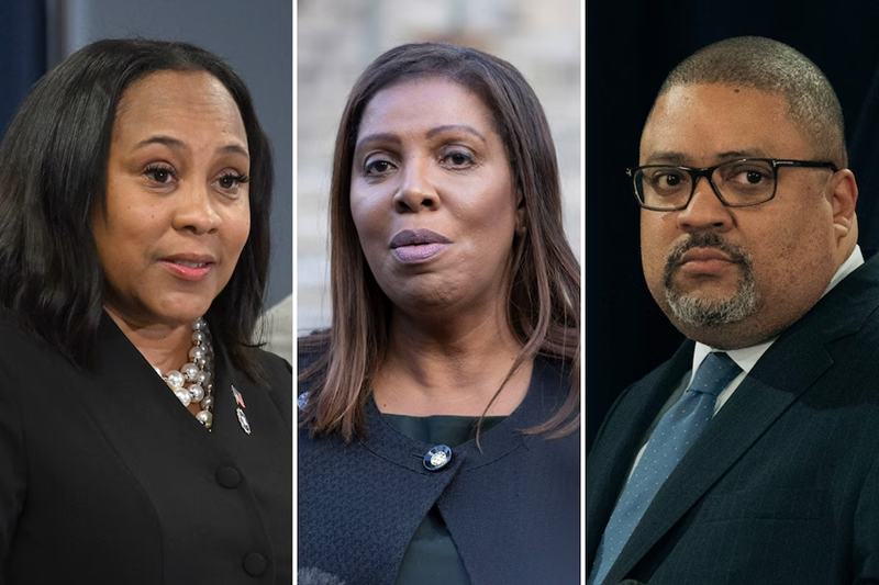 From left, Fulton County District Attorney Fani T. Willis, New York Attorney General Letitia James and Manhattan District Attorney Alvin Bragg (Stefan Jeremiah/AP); Joshua Lott/The Washington Post; Jeenah Moon for The Washington Post)