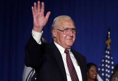 Former New Orleans Mayor Moon Landrieu waves at an event before the incumbent mayor, his son Mitch, arrives to address supporters after winning reelection in New Orleans Feb. 1, 2014. (AP/Gerald Herbert, file)