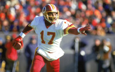 Doug Williams of the Washington Redskins scrambles with the ball during a 1987 NFL season game.